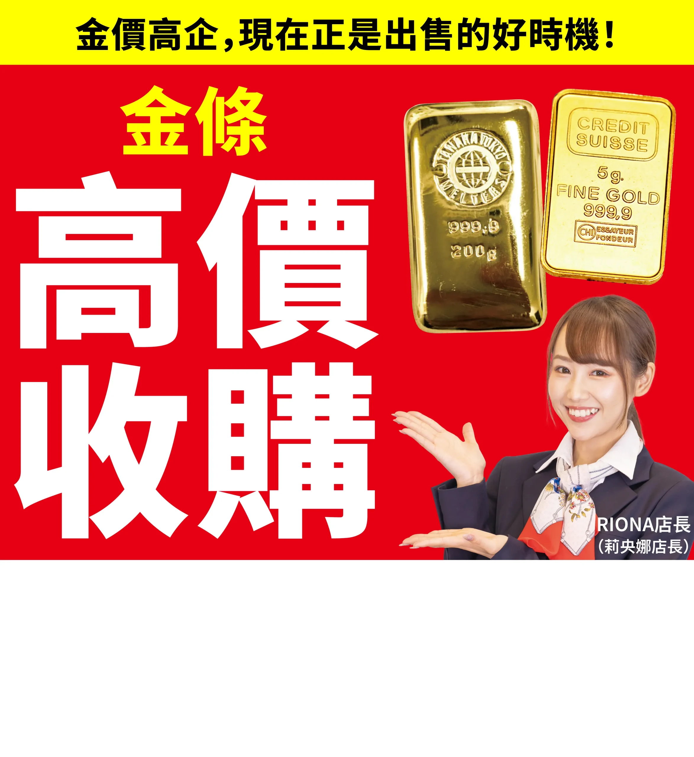 金條指的是經過精煉與固化後的黃金,原料僅使用純金(K24)。因此, 受到近年金價飆漲的影響,黃金金條的收購價格也隨之攀升。然而, 黃金的價值不保證會維持高檔,因此若您想出售,現在正是能高價收購的絕佳時機。
