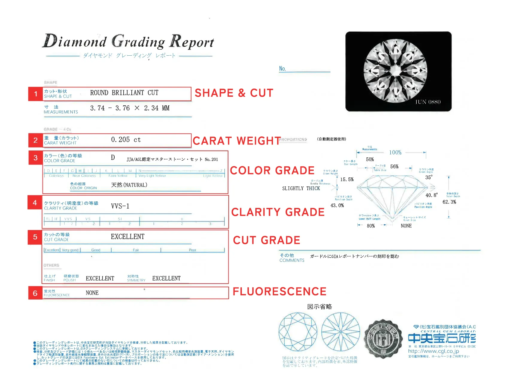 使用 GIA Facetware Cut Estimator 數據庫與目視評估,分為 Excellent、Very Good、Good、Fair、Poor 等等級。