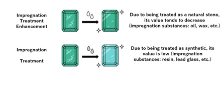 祖母綠是一種容易受損的寶石,因此市面上流通的祖母綠大多經過浸漬處理以提高透明度。未經浸漬處理的祖母綠被稱為「無油祖母綠(Non-Oil Emerald)」,其稀有價值極高,交易價格也很高。