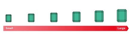 祖母綠的價值會隨尺寸增大而升高,但同時顏色和透明度等其他要素的平衡也至關重要。 例如,即使尺寸較大,但顏色較淡或透明度低的祖母綠,其評價可能比尺寸較小但顏色濃郁、透明度高的祖母綠更低。