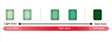 祖母綠自古以來就是深受喜愛的綠色寶石,其價值最關鍵的要素便是顏色。 祖母綠是主要由鈹(Be)組成的「綠柱石(Beryl)」礦物,因含有鉻和釩而呈現出美麗的綠色。 顏色不能過暗,以鮮豔的藍綠色到純綠色最受好評,顏色均勻的寶石被視為最高級。顏色越濃郁,評價越高,但若濃到看起來發黑,評價則會下降。