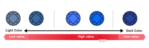 藍寶石常有色調不均的現象,因此顏色均勻濃郁的藍色藍寶石非常稀有,交易價格也很高。不過,如果顏色過於深濃,在昏暗處可能會失去光澤,因此濃度的平衡相當重要。藍寶石有各種顏色,其中被稱為「帕帕拉恰藍寶石」的粉紅色與橘色混合的寶石極其稀有,在收藏家中享有高人氣。